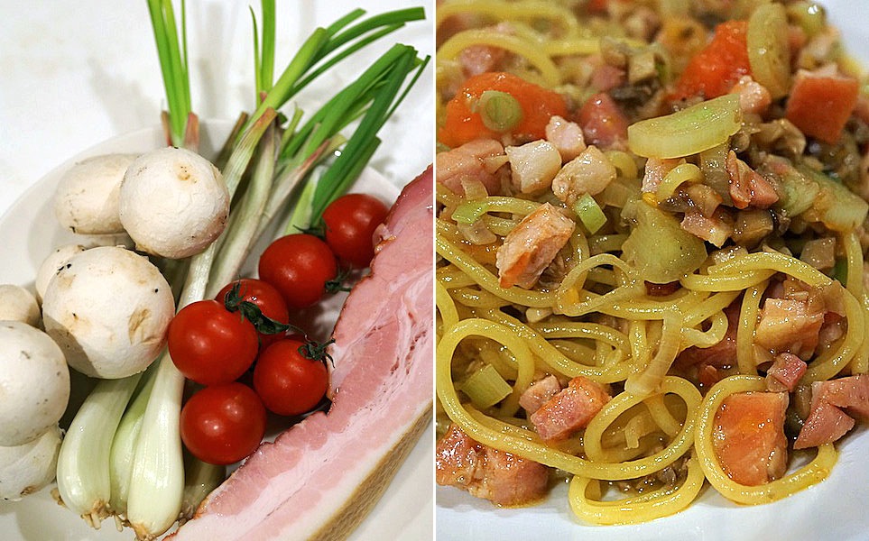 具材はベーコン、マッシュルームにエシャロット、それに小さなトマトを揃えておいしい塩とオリーブオイル…、それだけ使って味を作ってみることにする。