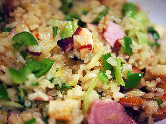週末の冷蔵庫の中の半材が全部ひとつになって、炒めご飯になっていく。