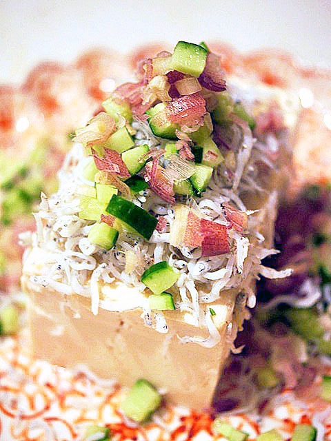豆の風味がミッチリとしたホロッとやさしい木綿豆腐に、シットリとしたしらすの食感、コツコツ、キュウリが歯ごたえくれてみょうがの香りと、軽い苦味がピリッとすべてをひきしめる。
