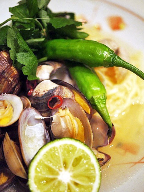アサリのスープをアサリごと、それから刻んだ三つ葉を飾り焼いたシシトウとスダチをそえて、塩アサリラーメンのできあがり。