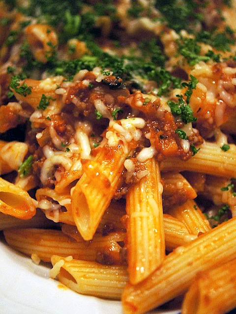 クニュクニュとしたペンネが奥歯や口の隅々撫で回し、ミートソースの肉がホツホツ、大きめに刻んだニンジンやセロリがコツコツ、歯ごたえたのしい、食べ始めると止まらぬ一品。