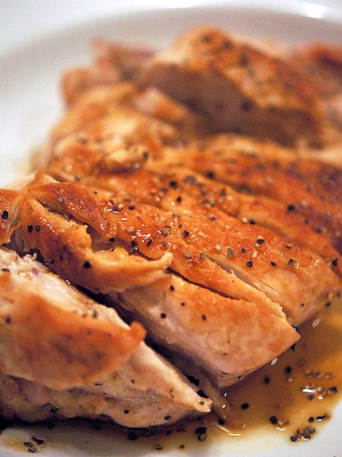 指で押し、中まで硬さを感じたら再び強火で皮目をコンガリ焼きあげて、ザクリと切ってお皿に並べ、胡椒をカリッで出来上がり。