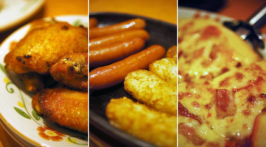 ムチュン、プチュンと焼いた卵やソーセージと、食感にぎやか。