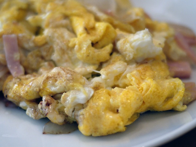 具材をやんわり包み込むように卵をまとめて折り返し、オムレツ状にしようとしたけど、具材の量を多すぎて、タマネギ入りいり卵…、みたいになった。