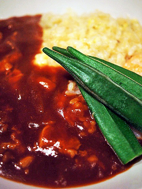 茹でたオクラをそっとおき、スプーンですくってハフハフ食べると、チーズの香りとハヤシライスが混じってなんとも奥深い。