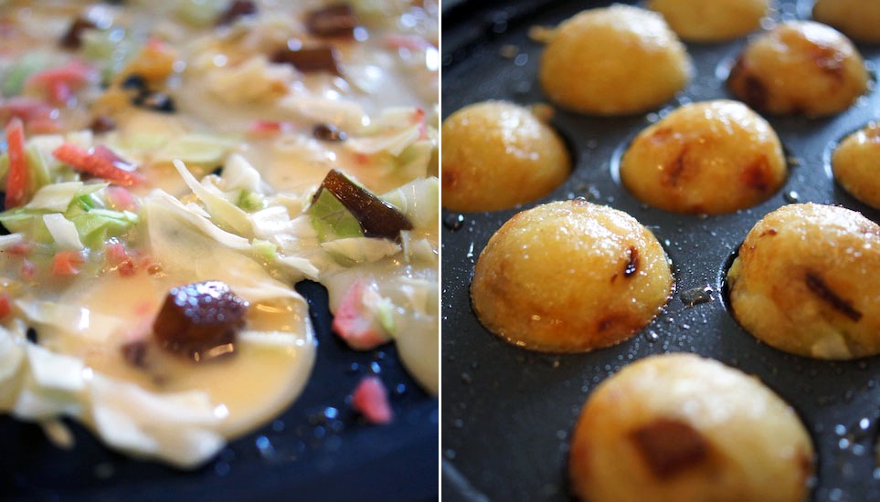 冷蔵庫の中の残り物を小さく切って使えばいろんなたこ焼きができるんですね。