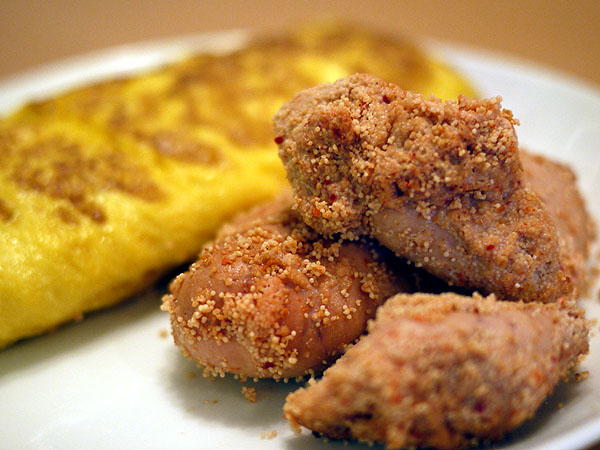 玉子三個を良く溶いて、砂糖であまく味付けしたの。