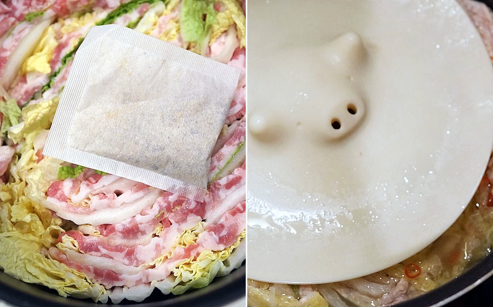 豚さんの顔をした落し蓋を乗せて、蓋して煮込んでいくと白菜から出た水気が鍋を満たしてく。