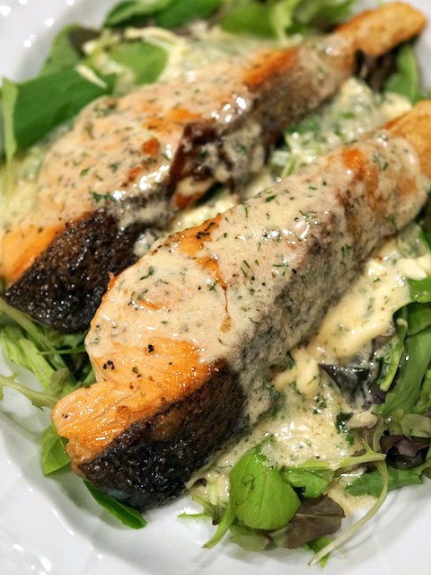 大きなお皿にベイビーリーフをこんもり盛って、それをベッドにソテしたサーモンをそっと置き、ソテしたフライパンに刻んだディルと生クリームを注いでレモンをギュギュッと搾る。