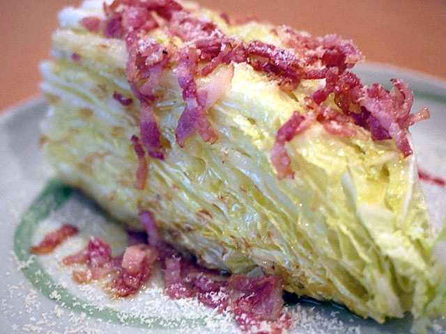 ベーコン刻んでオリーブオイルで炒めたモノを油も一緒にザザッとかけて、白菜ステーキのできあがり。