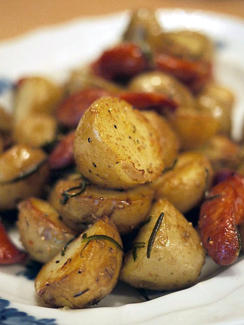 ちぎったローズマリーをタップリ入れて香りを出して、そこにザザッとお芋を入れてこんがり焦げ目がつくように。