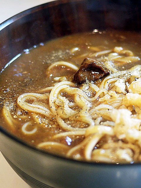 うどんの上にカレーをタップリ注ぎいれ、天かす、それから山椒をパパっ。
