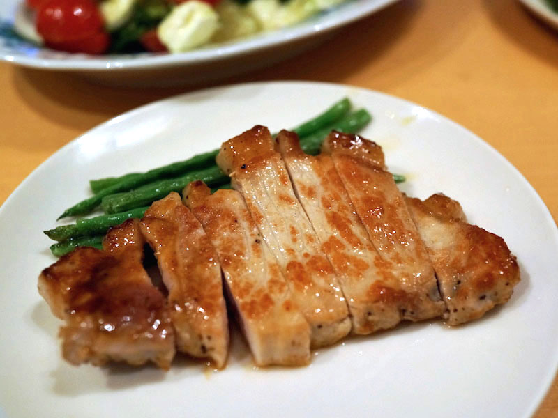 厚めに切ってもらった豚のロース肉。ナイフの背中でタンタン叩き、脂の部分に包丁入れて、フライパンにてこんがり焼いた。