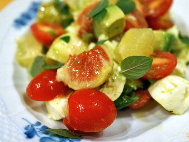 バジルの葉っぱは当然あって、けれどそこに熟したアボカド。グレープフルーツをザックリ切って、一緒にイチジク。