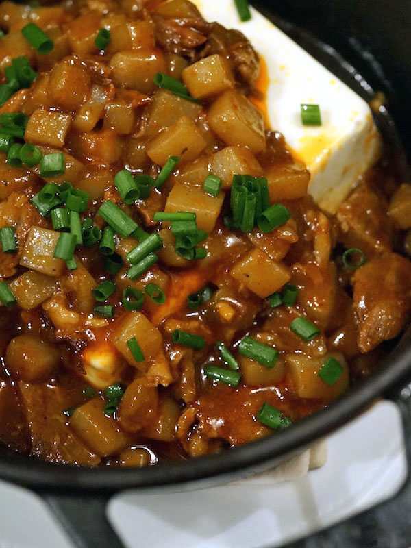 ニンニク油を注いで風味と照りをだし、湯通しをして芯まであっためた豆腐を入れたストゥブ鍋にトロンと注いで、麻婆豆腐の出来上がり。