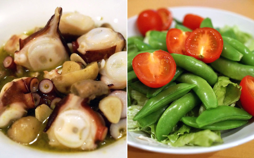 ツルンと前歯をすべるマッシュルームのなめらか。クニュクニュ、噛んで味わうタコと食感豊かで顎がよろこぶたのしい料理。