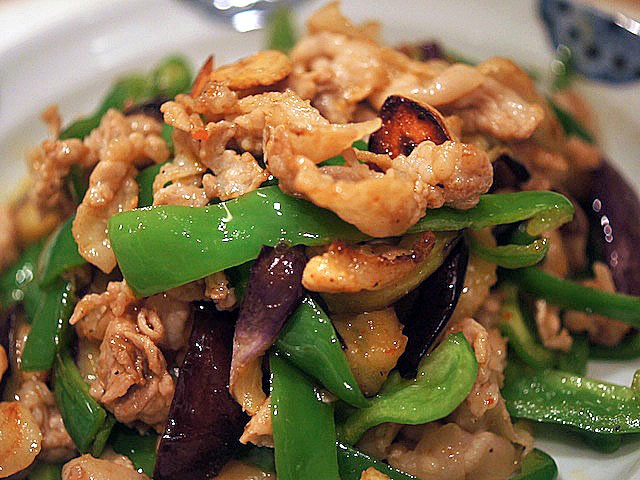 焼いた油にペペロンチーノオイルをくわえ、茄子をいためて肉とあわせて最後にピーマン。
