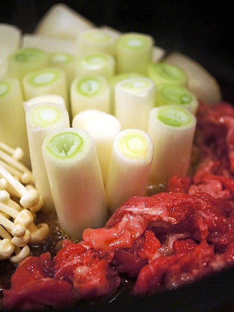 ネギはちょうどひと口大の大きさに切り、鍋の真ん中に立たせて置きます。