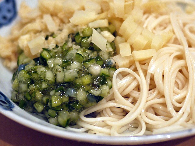刻んだタクワンのカリカリとした食感が極細麺にからんで唇、奥歯、顎から喉がぜぇんぶよろこぶたのしい味わい。
