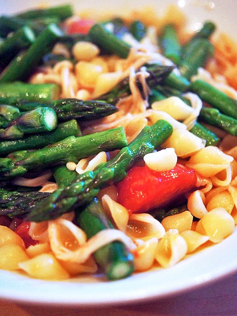 パスタが茹だる1分前にアスパラガスを鍋に入れ、ピピッとなったらザルにとりフライパンに入れて炒めてチャッチャッと仕上げる。