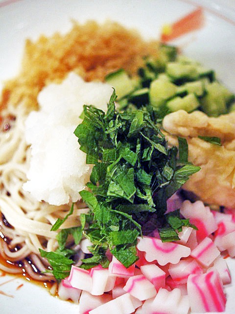 それらすべてを茹でて冷やしてキリッとしめたそばの上に飾って出汁と醤油をかけて出来上がり。
