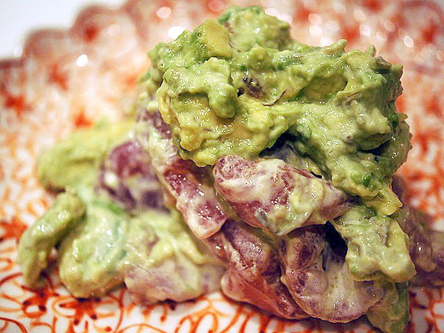 ムッチリとしたマグロを、トロンとなめらかなアボカドが包み込んでネットリおいしくしてくれて、なんともおいしい…、食べはじめるととまらぬゴチソウ、オキニイリ。