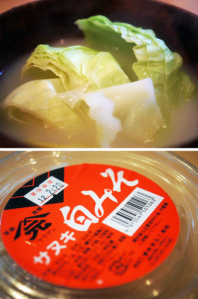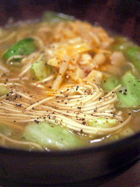 お椀に盛って、炒めたキャベツとメンマをのっけてズルッと食べる。