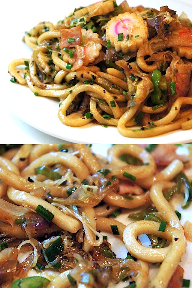より太くってスベスベしてて、味をなかなか受け付けない麺を使って焼きあげるため、ちょっと工夫が必要になる。