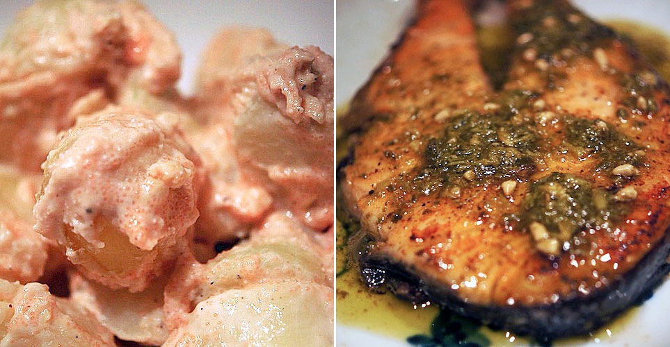 アトランティックサーモンの大きく、分厚く、しかも脂ののった切り身が今日、魚屋さんの目玉になってた。
