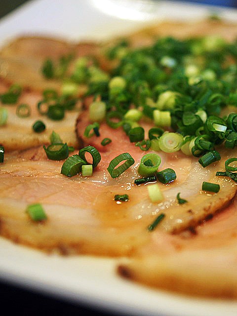 薄切りチャーシューでご飯を巻いて食べるとムッチリ。