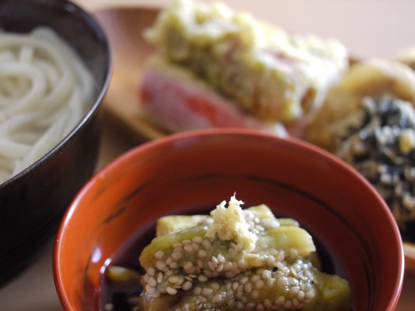 タレの中には焼いたナスの皮むいて、食べやすいようにザクッと切って入れました。