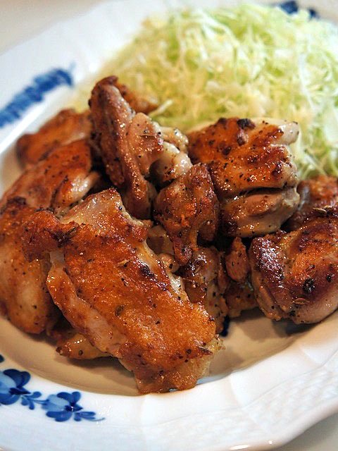 千切りキャベツを盛ったお皿に脂を切ってのってけ食べる。
