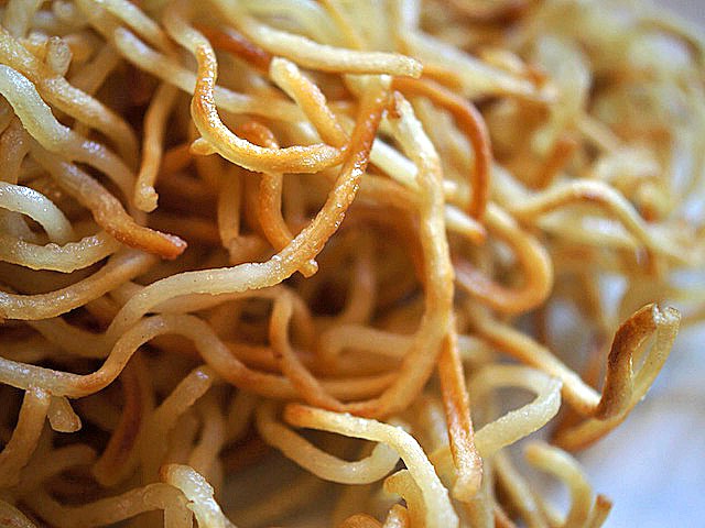 揚がり具合が少ない部分はシットリしてて、一度に異なる麺の食感たのしめる。