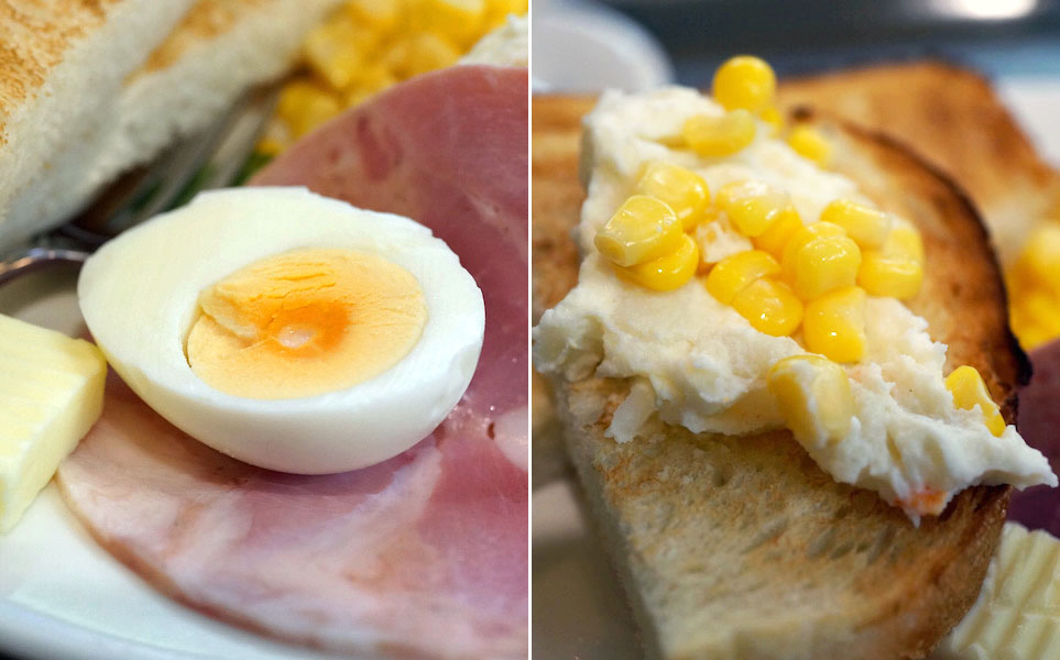 カサッと軽いトーストにポテトサラダに茹で卵。スイートコーンにハムにバターにほんの少しのマヨネーズ。