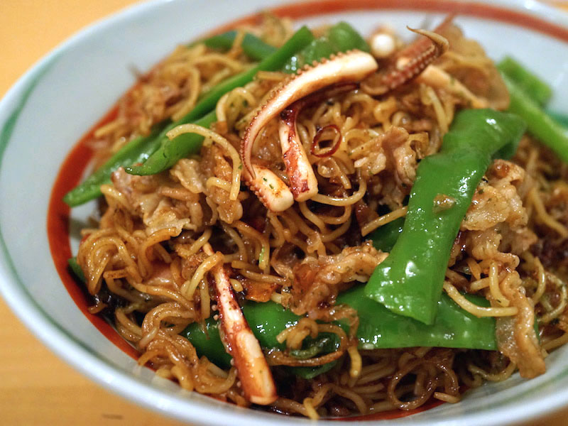 豚肉戻して麺に付属の粉末ソースを半分だけ。醤油で風味をつけたらタップリかつお節と青のりくわえて混ぜあわせ、お皿に移して出来上がり。