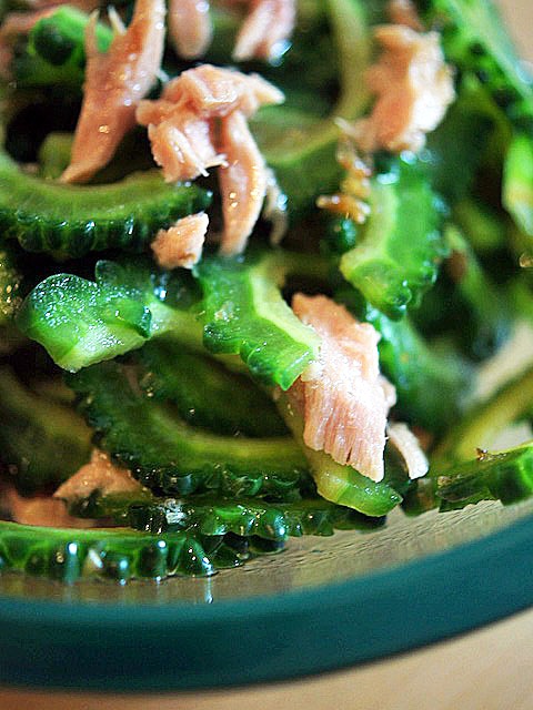 ほどよきサイズの手に取るとズッシリとした重たいゴーヤが手に入り、それを使ってサラダな感じの一品作ってサイドの料理といたします。
