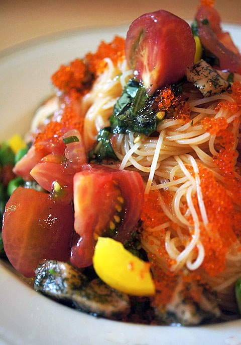 色鮮やかで、風味豊かでしかもプチプチ、小さな魚卵が奥歯で弾ける食感が、細いカッペリーニのたよりない食感おぎないおいしくさせる。