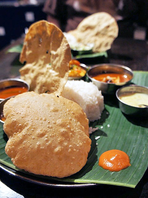 真ん真ん中にバスマティライスっていう、南インド独特のご飯を山にして、そこに小麦の生地を上げて作ったプーリと、同じく生地を薄くバリッと焼いたパバド。