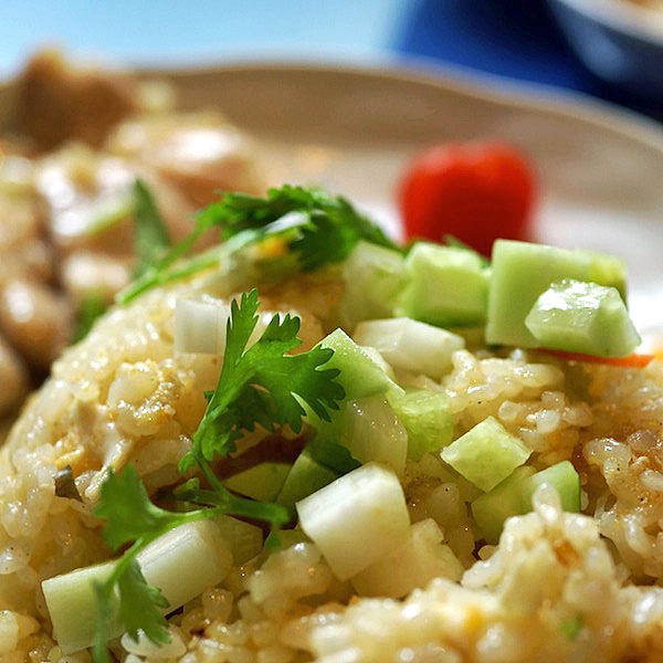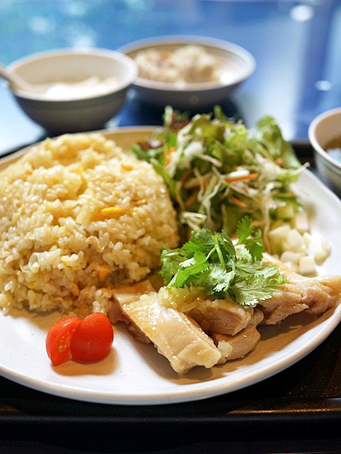 海南チキンライスのジャスミンライスを卵チャーハンにしたモノで、チャーハン熱々、鶏は冷たく野菜タップリというのがなんとも食欲そそる。
