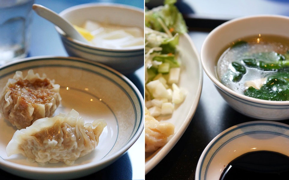 すべての料理がセットにできる…、唐揚げだとかチャーハンだとか4種類ほどのメニューが選べて、ボクは肉しゅうまいとフカヒレ餃子のセットをたのむ。