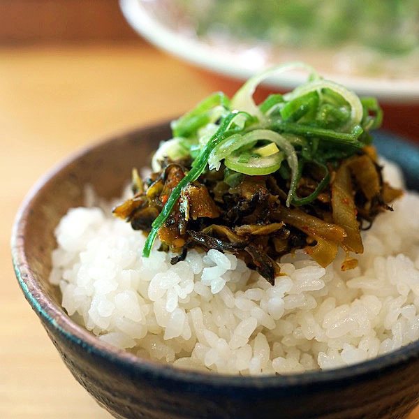 ランチタイムはご飯がサービスされるというのでそこに、辛子高菜をためしに乗っけて食べるとこれがまた旨い。