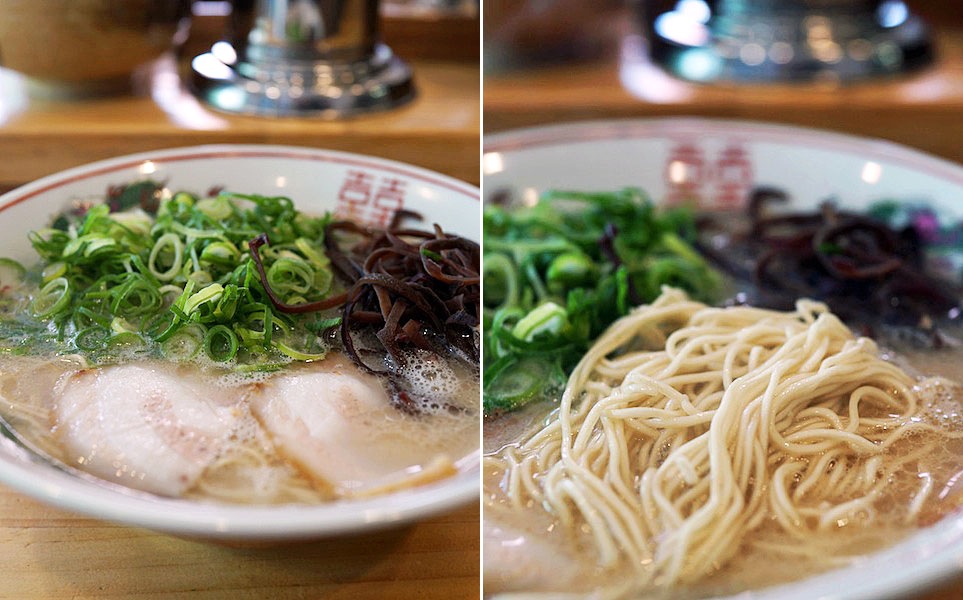 飾り気のないまさに博多のラーメンで、淡く白濁したスープ、薄切りチャーシューがペロンと2枚にドッサリ青い博多ネギ、そしてキクラゲ、それ以外のモノはなし。