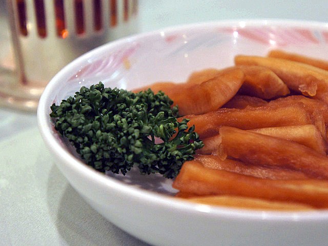 細切りにした大根を、軽く干したのを醤油とお酢に漬け込んだ、口がシャキッとする漬物で、これを長島さんは最初から最後までずっと食べ続け気がついたらば20人前も一度にお腹に放り込んだ…、なんて逸話があったりします。