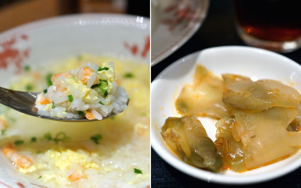 お茶漬け以上でお粥以下という、ご飯の状態が絶妙で、舌の上でパラリとほぐれて喉からお腹を温かにする。刻んだエビがプチプチはぜて、玉子がふっくら、全てをつつんでやわらかにする。塩が基本の味付けでおいしすぎない…、だから舌が素材の味を探して一生懸命働き始める。それで頭も目覚める趣向。