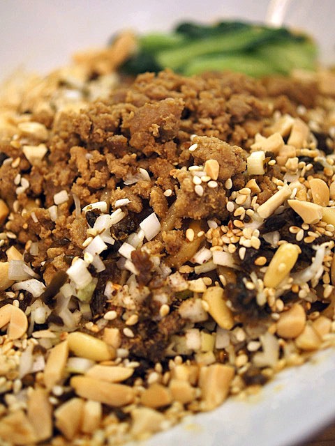 ナッツや野菜、それにひき肉で麺がおおわれやってくる。