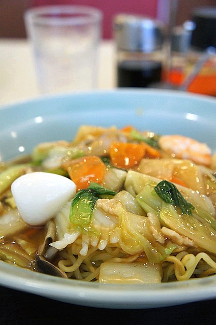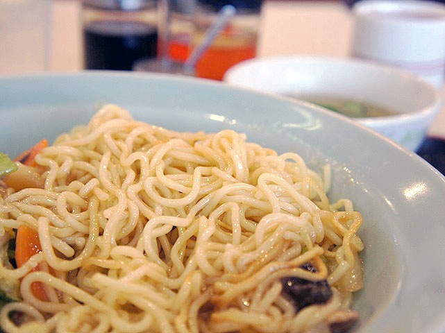 新北京の五目焼きそばは、本来、麺の半分程がカリッと揚げ焼きされているモノ。