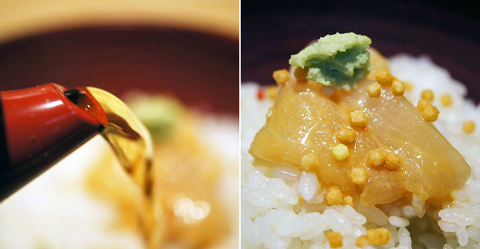 わさびを少々、アラレをパラリとちらして食べると、焦げた香りとパリポリ、あられが壊れる歯ざわりがムッチリとした鯛の切り身の食感引き立て、おいしくさせる。