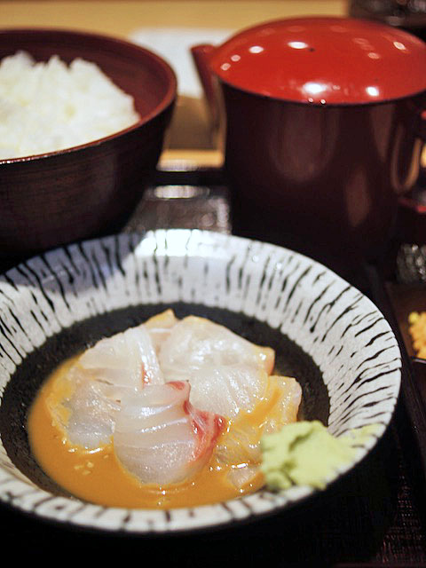 冬の魚といえばムッチリした鯛だなぁ…、胡麻和え鯛を出汁かけ茶漬けにして味わうという朝のお腹にたのしい料理。