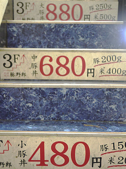 丼のご飯と肉の量を明記した貼り紙が、階段のステップ部分に貼り付けられてる。