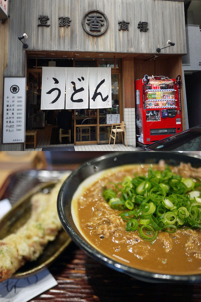 カレーうどんに肉うどん用の煮込んだ牛肉いれてもらってビーフカレーうどんにし、そこに竹輪の天ぷらのっける。